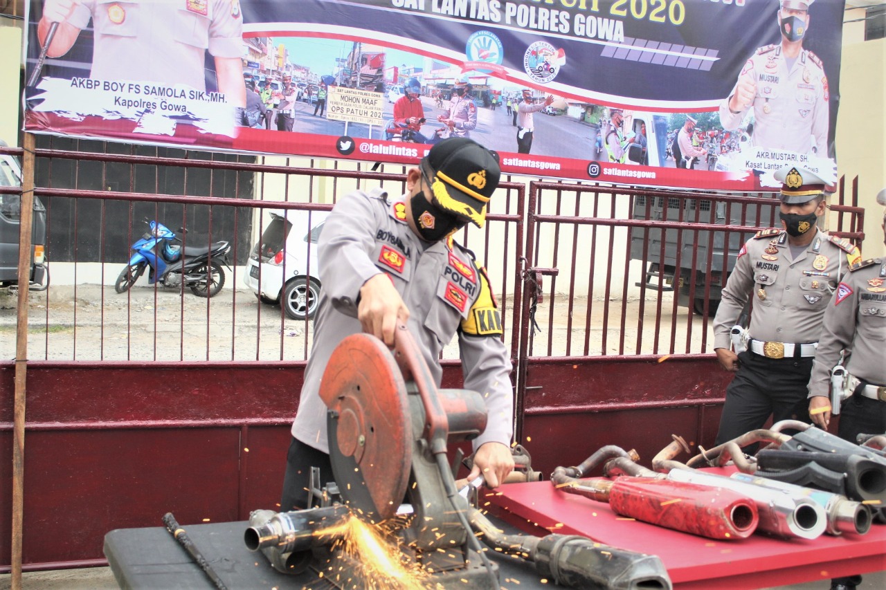 Dalam giat pemusnahan tersebut di awali oleh Pemotongan Knalpot Racing secara simbolis oleh Kapolres Gowa AKBP Boy Fs Samola S.IK MH di lanjutkan oleh segenap Pejabat utama Polres Gowa.