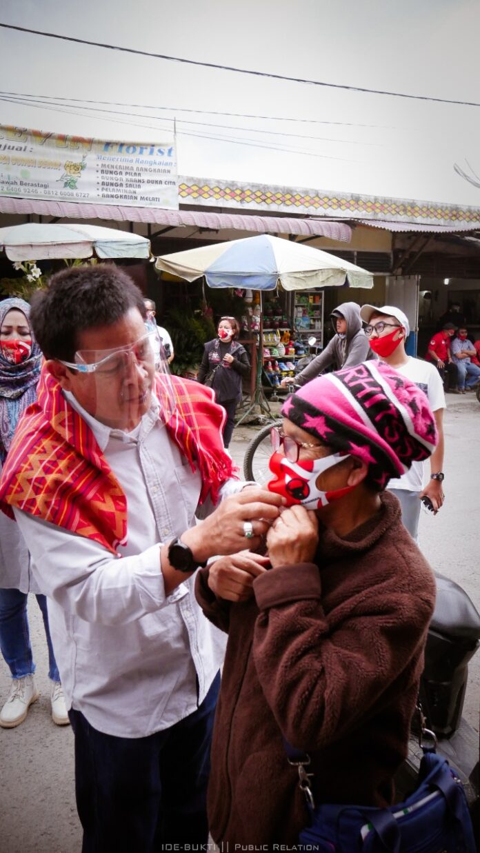 Global Cyber News|Karo,Calon Bupati Karo Iwan Sembiring Depari yang diusung Partai Demokrasi Indonesia Perjuangan (PDIP), bersama tim relawan bagikan sejumlah masker kepada masyarakat di pusat pasar Berastagi, Kecamatan Berastagi, Kabupaten Karo,selasa (22/09) 2020.