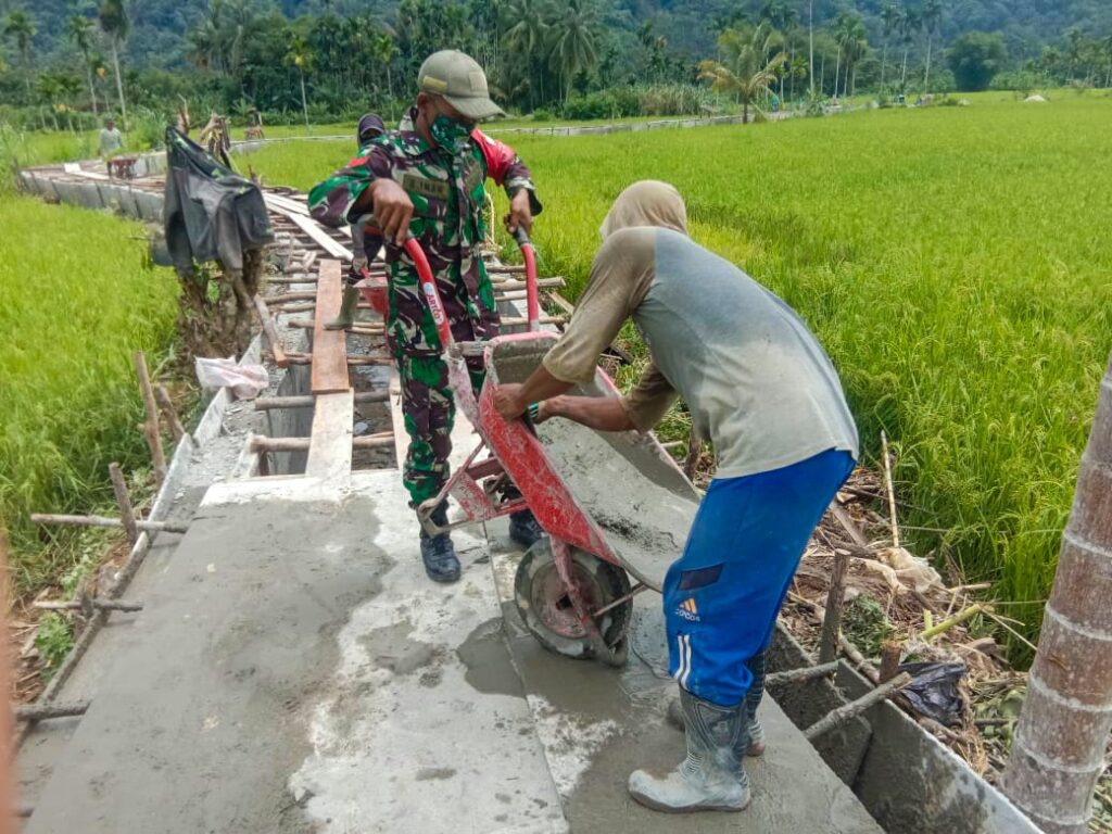 Global Cyber News|Aceh Timur – Babinsa Koramil 01/Serbajadi Koptu Sulaiman melaksanakan gotong royong bersama warga dengan mengecor irigasi, untuk menunjang pengairan persawahan di Desa Tualang, Kecamatan Serbajadi, Kabupaten Aceh Timur, Senin (12-10-2020).