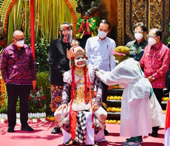Global Cyber News.Com|Presiden Joko Widodo meninjau pelaksanaan vaksinasi Covid-19 secara massal dalam kunjungan kerja ke Provinsi Bali pada Selasa, 16 Maret 2021. Kegiatan vaksinasi massal pada kunjungan tersebut dipusatkan di Puri Saren Agung, Kecamatan Ubud, Kabupaten Gianyar.