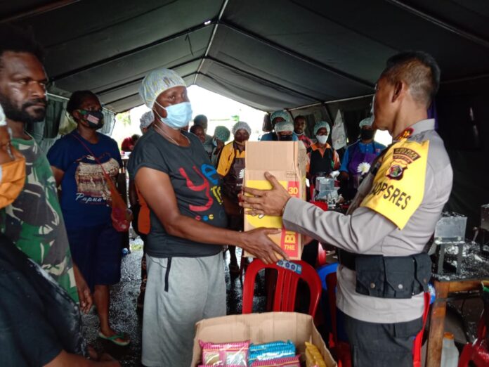 Global Cyber News.Com|Polda Papua, Polres Merauke, – Kepala Kepolisian Resor Merauke AKBP Ir. Untung Sangaji, M.Hum Bersama ajudannya tadi sore membagikan bantuan 3 karton kepada mama-mama papua yang bertempat di Dapur lapangan Mapolres Merauk.. Minggu,21/3/2021.