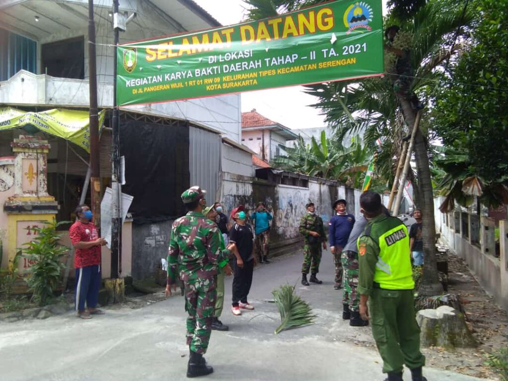 Komandan Koramil 03 Serengan Kodim 0735 Surakarta Kapten Inf Tri Sakti K beserta Anggotanya bersama dan Warga Masyarakat melaksanakan Kegiatan Kerja Bakti rangka persiapan pelaksanaan KBD tahap II TA. 2021 di Jl. Pangeran Wijil 1 RT 01/ RW 09 Kelurahan Tipes Kecamatan Serengan Kota Surakarta.