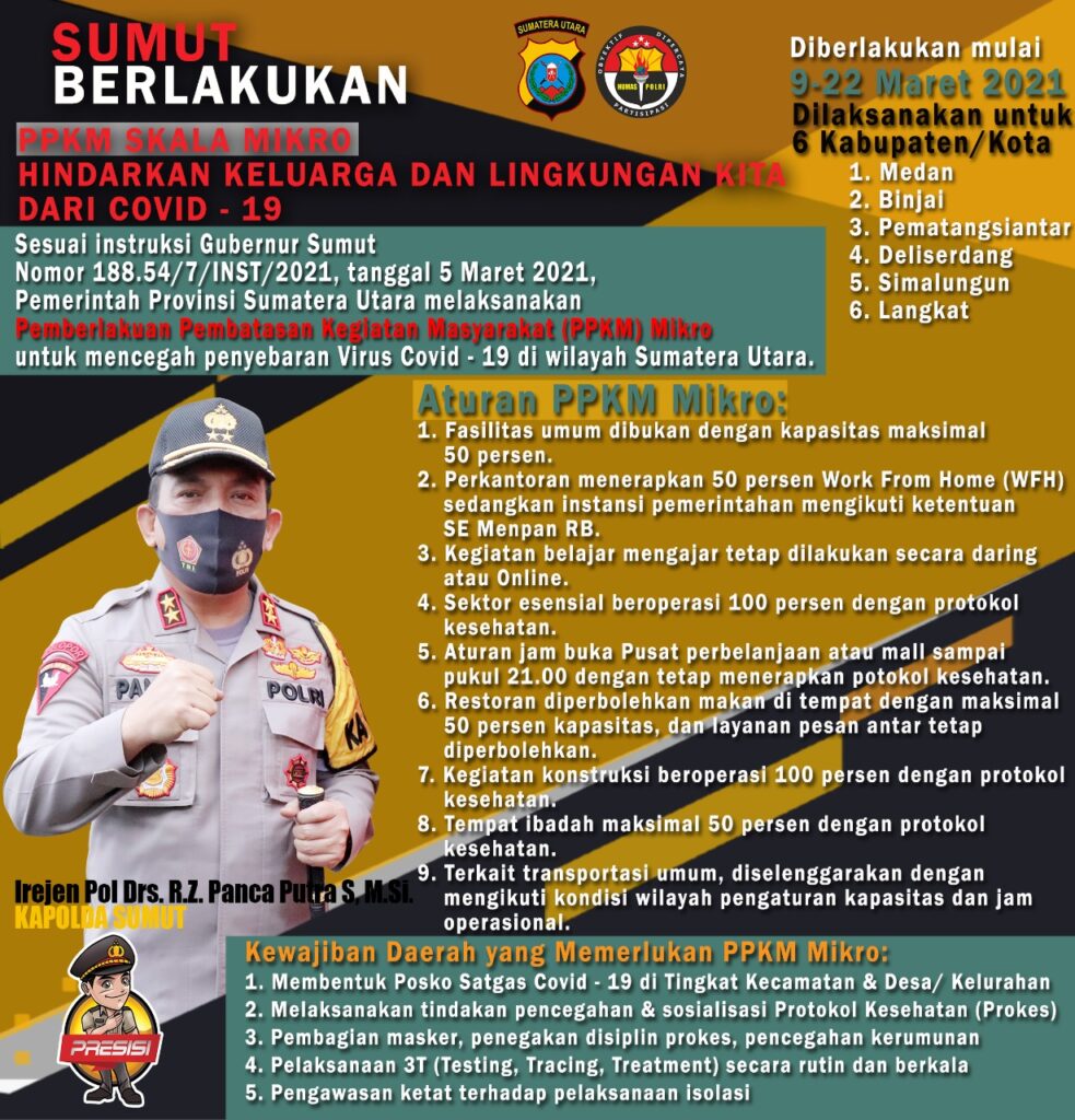 Aturan tersebut berupa pembatasan kegiatan perkantoran atau Work From Office (WFO) sebesar 50 persen, makan di restoran dibatasi 50 persen dengan membolehkan layanan pesan antar, dan fasilitas umum dibatasi maksimal 50 persen. Penetapan Pemberlakuan Penerapan Kegiatan Masyarakat sekala Mikro juga didasari surat keputusan Gubernur Sumut kepada 6 kota dan Kabupaten yang meliputi Kota medan, Binjai, Pematangsiantar, Simalungun dan Langkat.