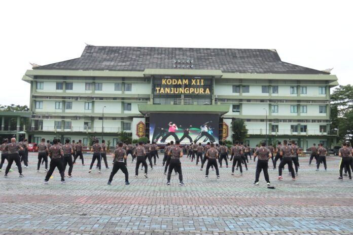 Global Cyber News.Com|Kubu Raya, Kamis (25/3/21) – Panglima Kodam XII/Tanjungpura, Mayjend TNI Muhammad Nur Rahmad dan para Pejabat Utama Kodam XII/Tpr melaksanakan olahraga bersama Prajurit dan PNS bertempat di lapangan Apel Makodam XII/Tpr, Sungai Raya, Kubu Raya.