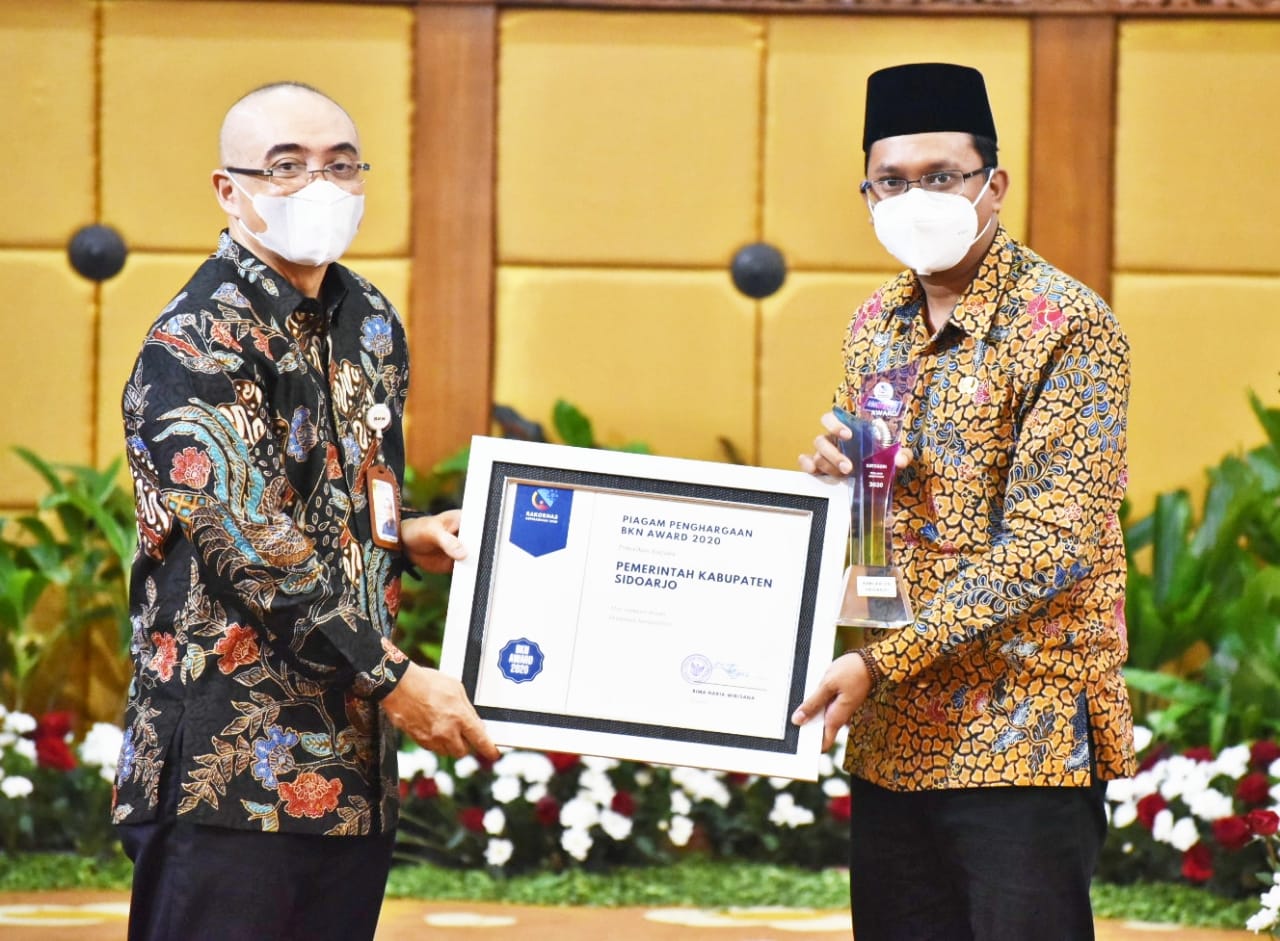 Global Cyber News.Com|sidoarjo |Bupati Sidoarjo Ahmad Muhdlor (Gus Muhdlor) menerima Penghargaan BKN Award 2020 dari Kepala BKN RI Bima Arya Wibisana atas Pencapaian Terbaik Pertama kategori III Penilaian Kompetensi Tingkat Kabupaten secara Nasional, di Ruang Hayam Wuruk, Sekretariat Daerah provinsi Jawa Timur, Kamis (1/4).
