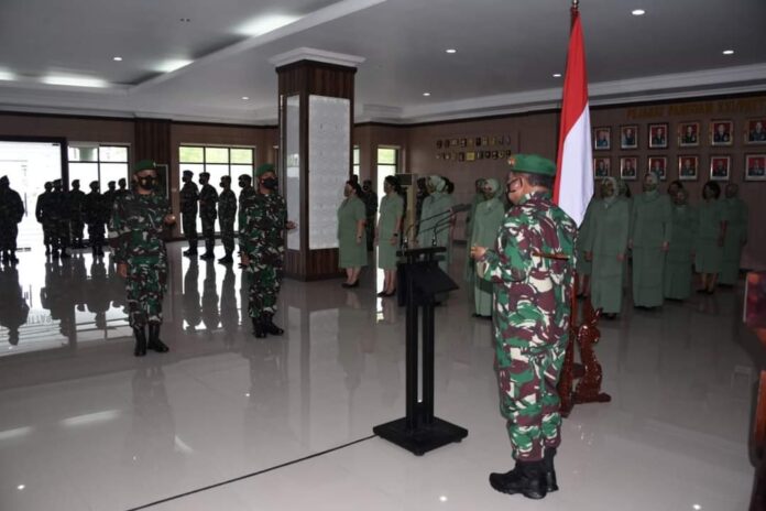Pangdam XVI/Pattimura Mayjen TNI Jeffry A Rahawarin memimpin langsung laporan Korps Kenaikan Pangkat Perwira Kodam XVI/Pattimura, di Lobby Makodam, Kamis (01/04/2021) mewakili Bintara dan Tamtama mengingat ditengah situasi Pandemi Covid-19 sehingga dilaksanakan tidak secara bersama-sama.