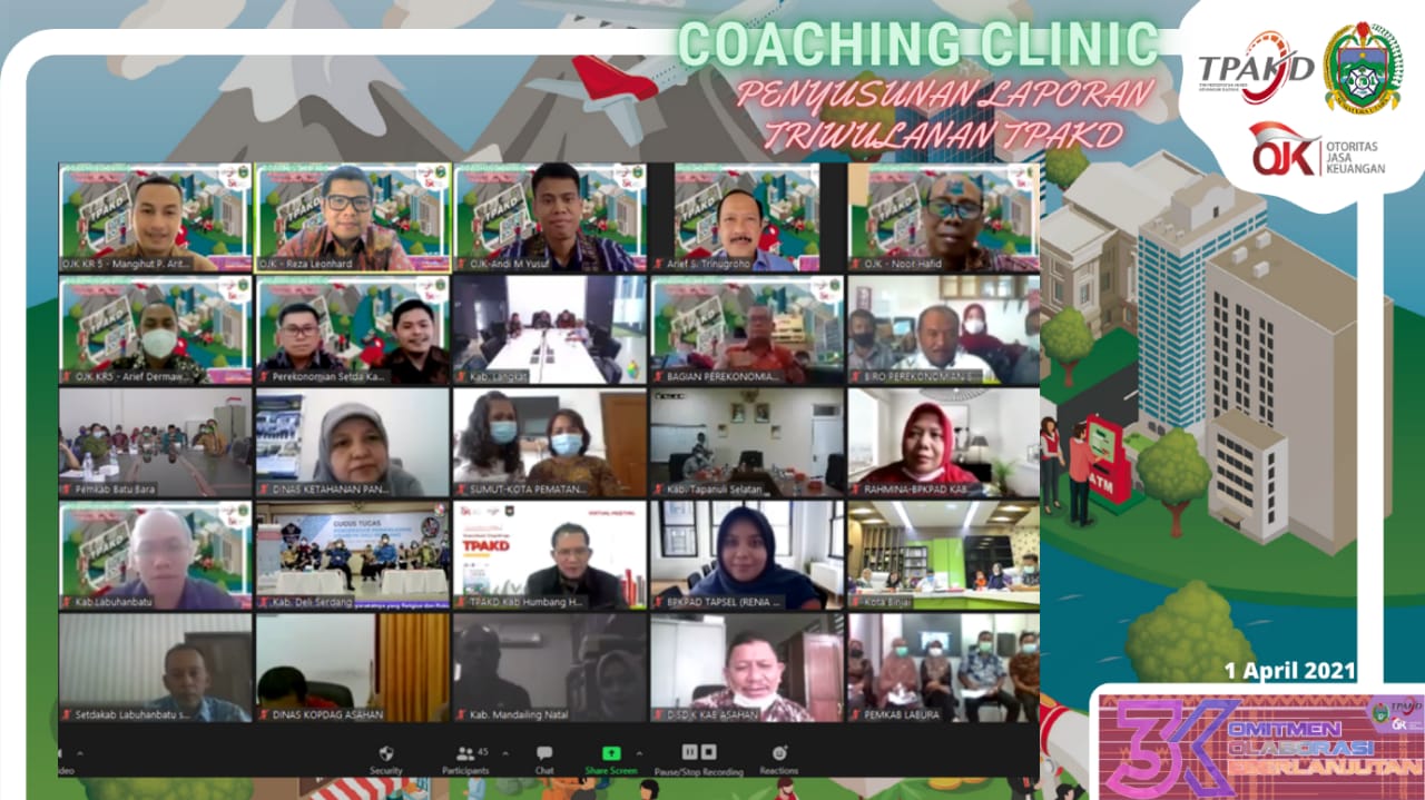 Global Cyber News.Com|-Medan I Dalam rangka penguatan koordinasi dan capacity building pengurus dan anggota Tim Percepatan Akses Keuangan Daerah (TPAKD) seluruh kabupaten/kota se-Sumut khususnya terkait asistensi penyusunan Laporan Triwulanan TPAKD, OJK Kantor Regional 5 Sumatera Bagian Utara (KR5 Sumbagut) bekerja sama dengan Pemprovsu kembali menggelar kegiatan Coaching Clinic TPAKD se-Sumut secara virtual zoom 1 April 2021.