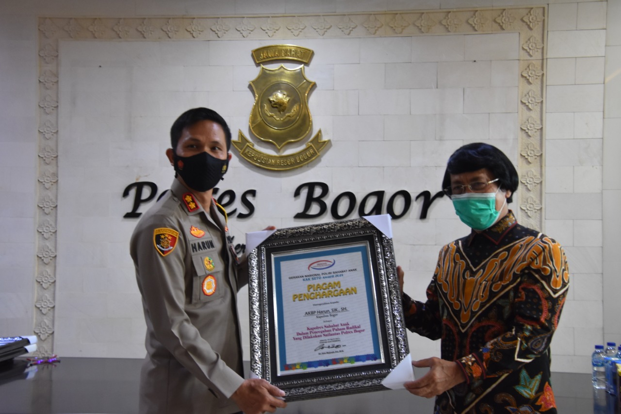 Global Cyber News.Com|Kapolres Bogor AKBP Harun S.I.K., S.H, Tuai Penghargaan dari Kak Seto sebagi tokoh dan organisasi yang peduli terhadap perkembangan, kesejahteraan dan juga perlindungan terhadap anak. penghargaan yang sama juga di berikan kepada Kasat Reskrim Polres Bogor Handreas Ardian S.H., S.I.K dan juga Kasat Lantas Polres Bogor Iptu Dicky Anggi Pranata S.I.K., M.Si., C.P.H.R