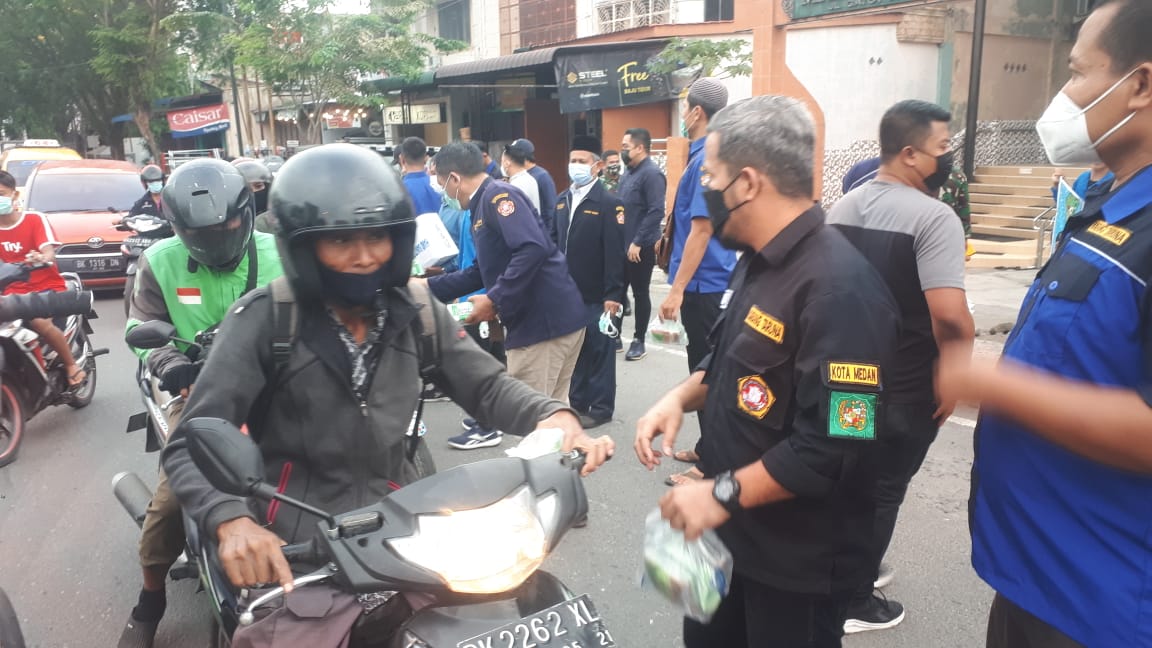 Global Cyber News.Com|Pengurus Karang Taruna Kota Medan berbagi Takjil di penghujung Azan Maqrib menuju berbuka puasa di jalan Gatot Subroto dan Titi papan, kecamatan Medan Petisah. Medan, 28 April 2021.