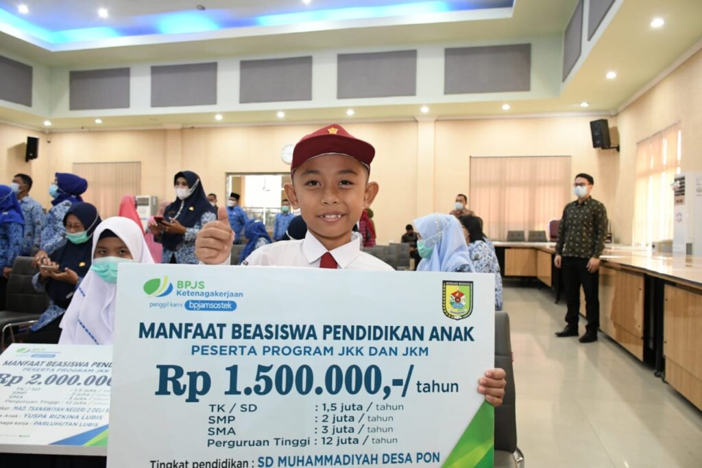Seusai melaksanakan upacara, Bupati kemudian menyerahkan secara simbolis beasiswa pendidikan kepada para pelajar yang menjadi ahli waris peserta BPJS Ketenagakerjaan. Penyerahanan simbolis ini diberikan kepada 5 pelajar dari jenjang yang berbeda mulai dari SD hingga perguruan tinggi.