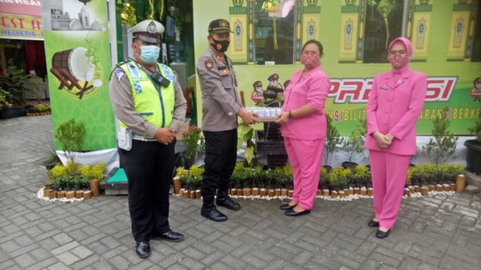 Ketua Cabang Bhayangkari Medan Ny.Dini Riko Sunarko yang di wakili oleh Ketua Ranting Bhayangkari Polsek Medan Helvetia Ny.Ria Pardamean Hutahaean yang didampingi Ny.Dara Zuhatta Mahadi memberikan bingkisan kepada petugas Pos X Mahattan di Jalan Gatot Subroto persimpangan Jalan Asrama kelurahan Sei Sekambing C II kecamatan Medan Helvetia. Sabtu (08/05/2021) sore
