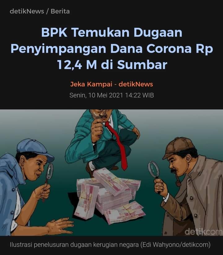 Global Cyber News.Com|Badan Pemeriksa Keuangan (BPK) RI menemukan dugaan penyimpangan anggaran penanganan COVID-19 di Sumatera Barat (Sumbar). Hal itu tertera dalam Laporan Hasil Pemeriksaan (LHP) atas Laporan Keuangan Pemerintah Daerah (LKPD) Provinsi Sumatera Barat tahun anggaran 2020.