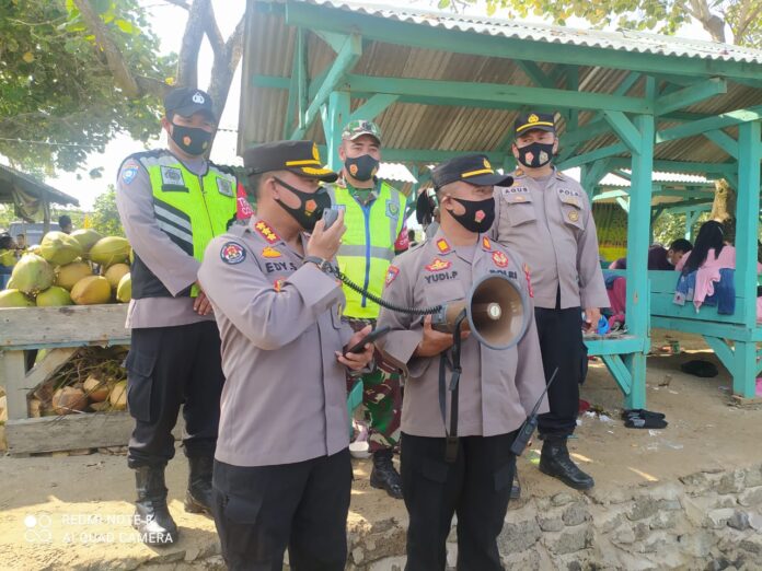 Global Cyber News.Com|ANYER – Kepolisian Daerah (Polda) Banten bersama TNI dan Satgas Covid-19 sosialisasikan Instruksi Gubernur Nomor: 556/901-Dispar/2021 di tempat wisata.