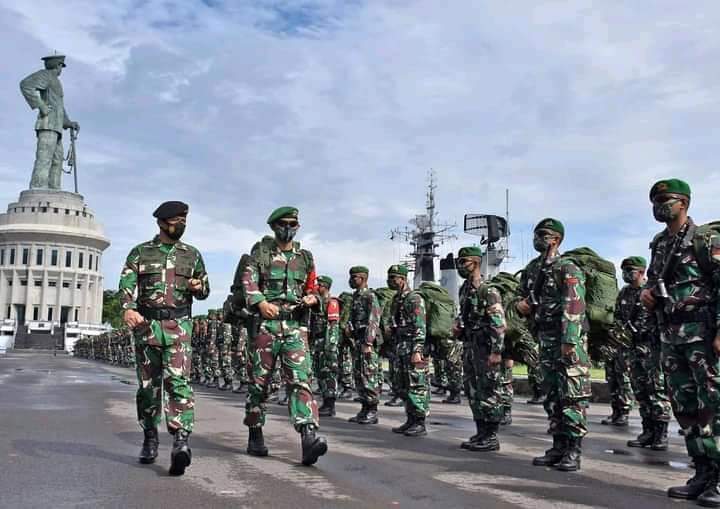 Global Cyber News.Com|Dispen Kormar (Sidoarjo). Komandan Brigif 2 Marinir Kolonel Marinir Rudi Harto Marpaung mewakili Komandan Pasmar 2 Brigjen TNI (Mar) Ipung Purwadi, M.M menghadiri upacara pemberangkatan Satgas Yonif Mekanis 521/Dadaha Yhoda dalam rangka Operasi Pamrahwan Wilayah Papua TA. 2021 di Dermaga Madura Koarmada II Ujung, Surabaya, Jawa Timur. Jumat (28/05/2021).