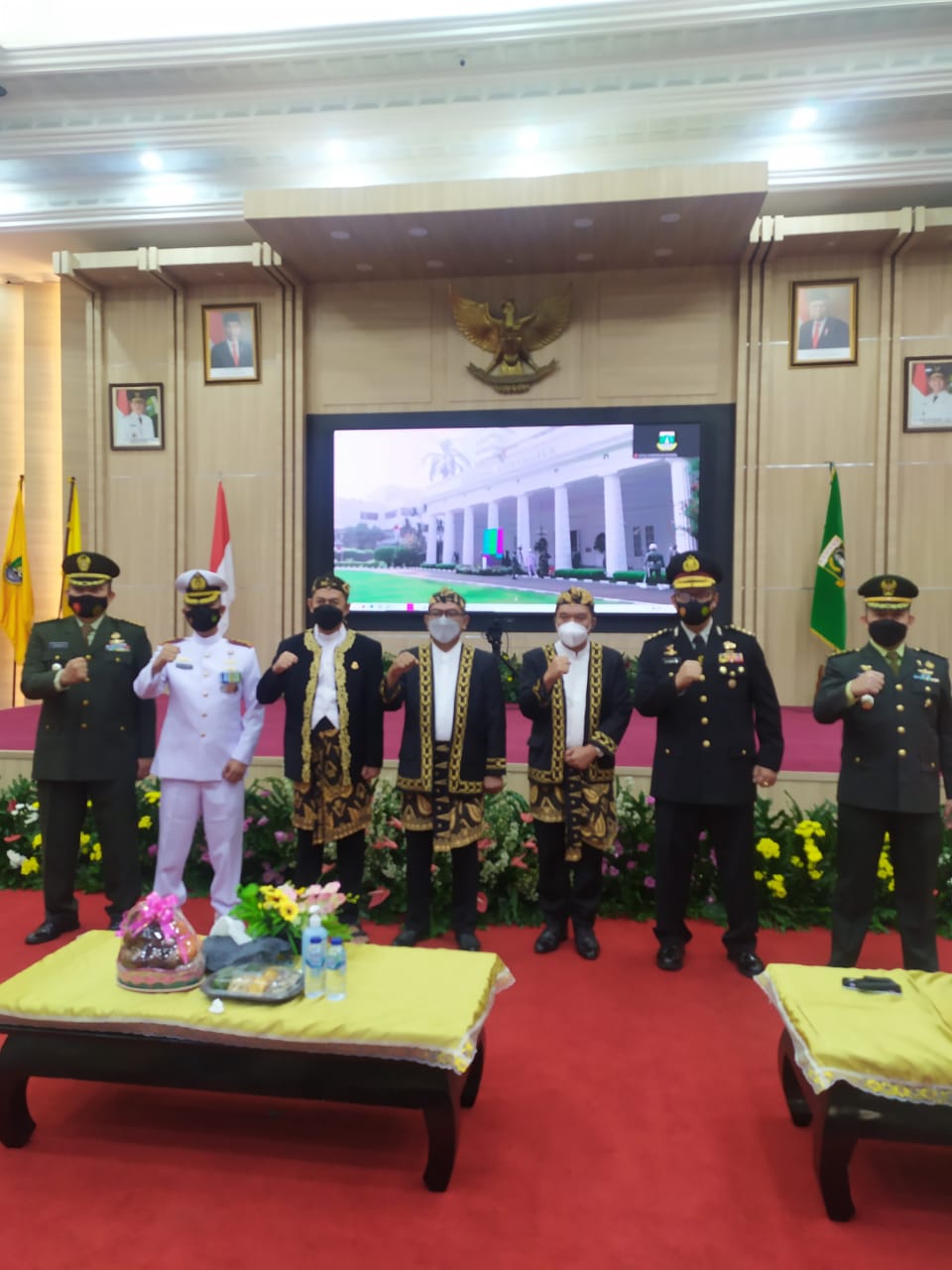 Kabidkum Polda Banten bersama ketua DPRD Banten, Sekda Provinsi Banten, Anggota DPRD, Danrem 064 Banten, Danrem 052 Tangerang dan Dan Lanal Banten mengikuti upacara secara virtual melalui video conference di Pendopo Gubernur Banten KP3B.