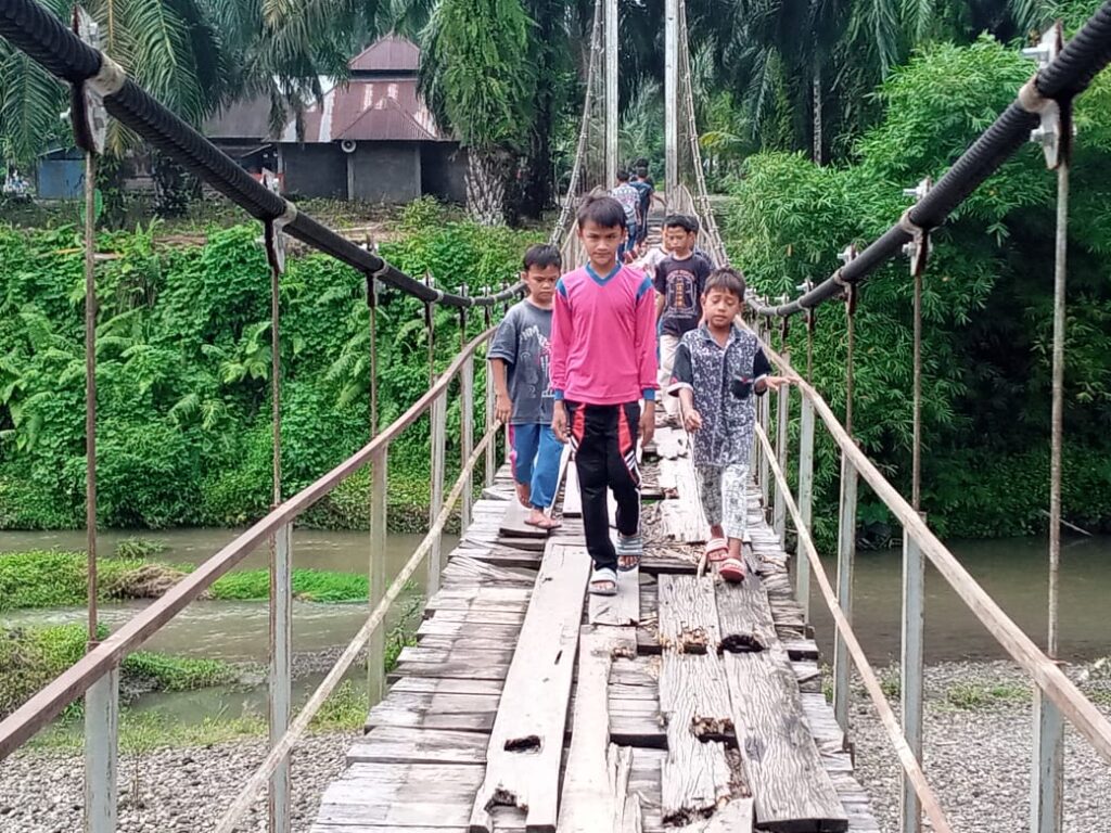 “Kami sangat merasa kecewa melihat jembatan gantung ini, belum mencapai dua tahun, kondisi lantainya sekarang sudah tidak utuh lagi sudah banyak yang bolong dan lapuk,” sebutnya, Rabu.