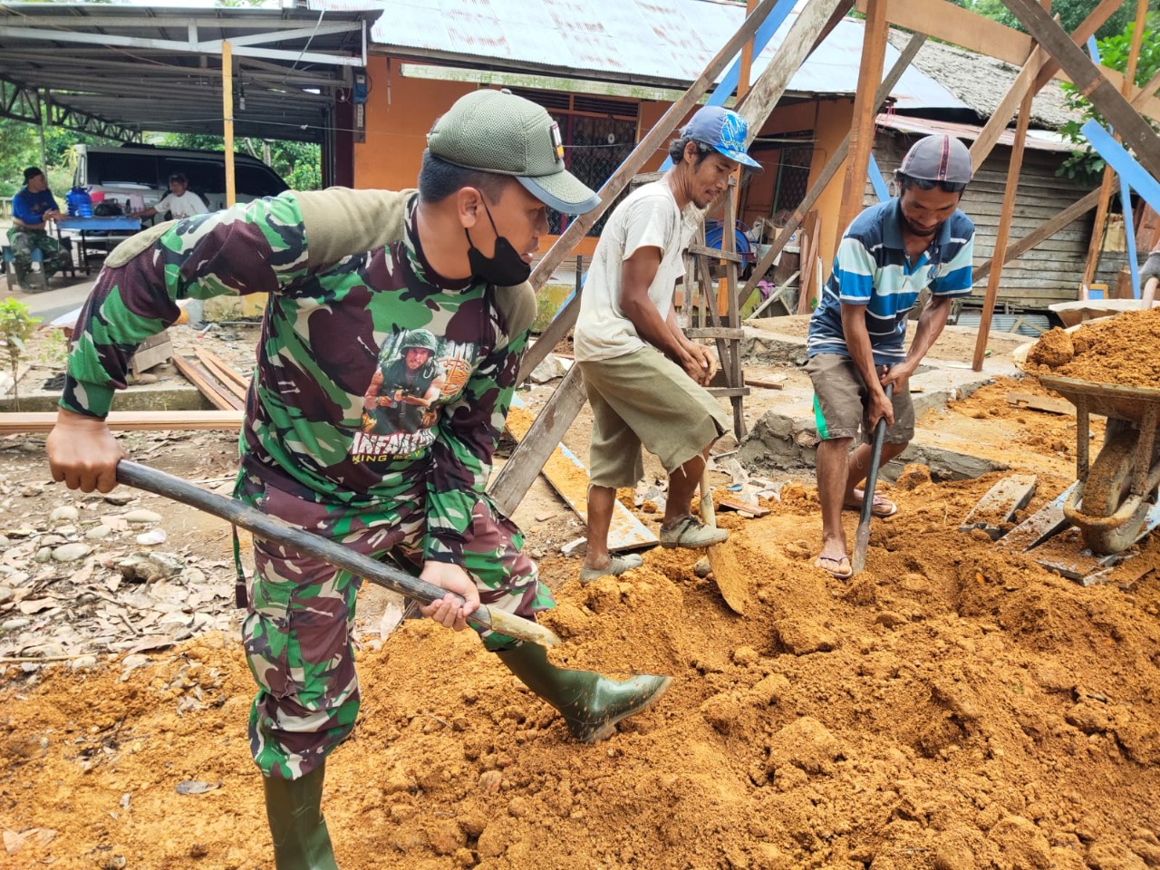 Hal ini dapat dilihat saat warga masyarakat desa Kasarangan RT. 008 RW. 003 Kec. Labuan Amas Utara Kab. Hulu Sungai Tengah bersama anggota Kodim 1002/HST bergotong royong menguruk pondasi renovasi Musholla Noor Iman salah satu sasaran tambahan dalam program TNI Manunggal membangun Desa (TMMD) ke-112 tahun 2021 Kodim 1002/HST. Senin (13/09/2021) sore