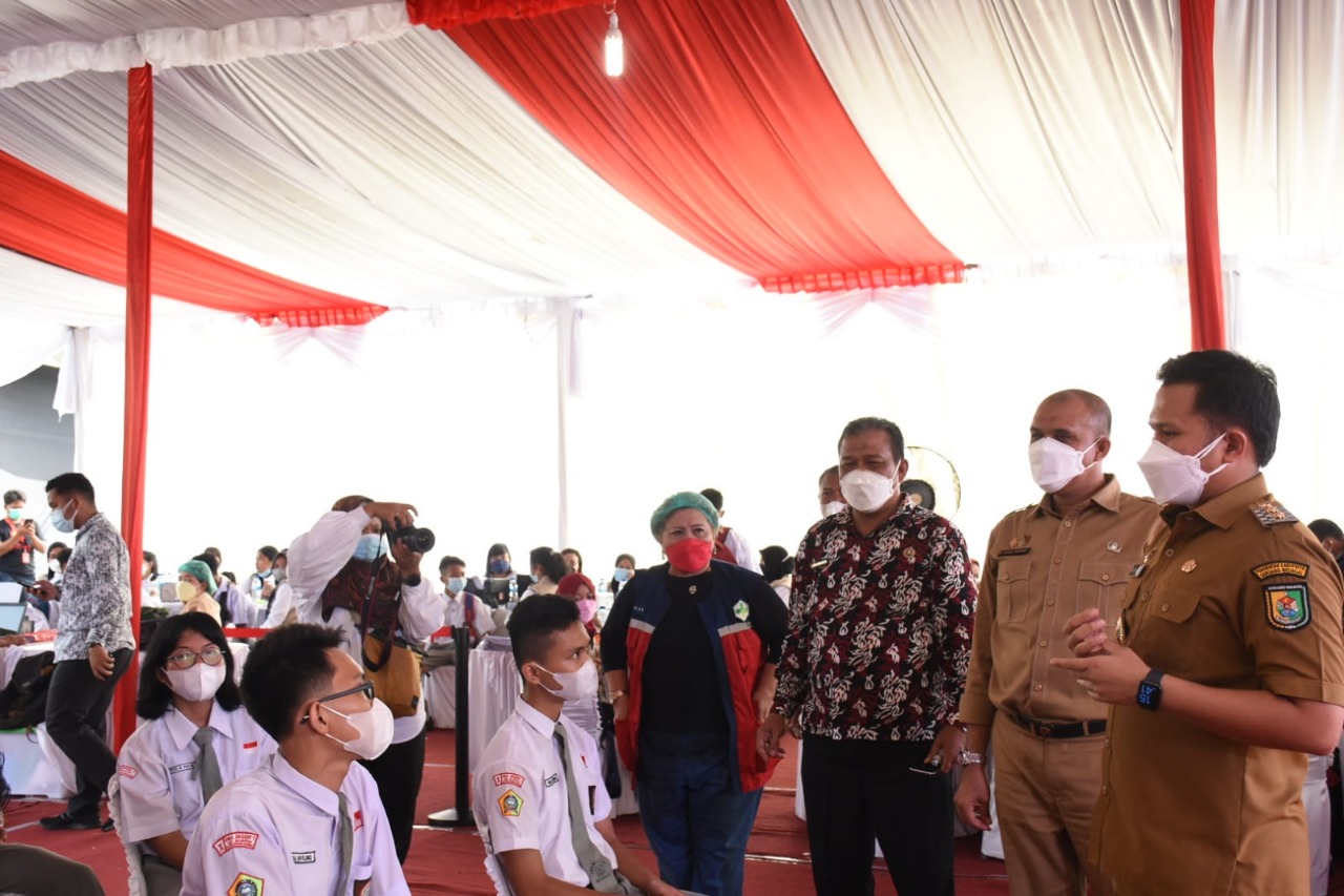 Bupati Sergai H. Darma Wijaya dan Wakil Bupati H. Adlin Umar Yusri Tambunan, ST, MSP berkesempatan hadir langsung meninjau proses pelaksanaan vaksinasi massal bagi pelajar yang dilaksanakan di Kecamatan Perbaungan dan Sei Rampah, Kamis (16/9/2021).