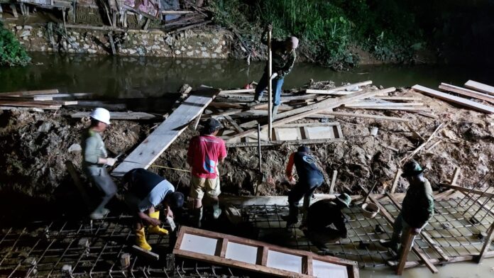 Meski dengan penerangan yang minim, Satgas TMMD dibantu masyarakat Kampung Cilaban terus bergotong-royong mulai pengangkutan bahan material kayu dan juga besi.