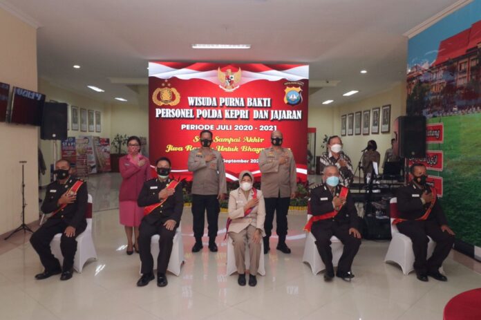 Global Cyber News.Com| Batam – Pada hari ini Polda Kepulauan Riau menggelar Wisuda Purnawira Bhakti sebanyak 77 personel pada Periode Juli 2020 – Juli 2021 T.A 2021 dengan tema Setia Sampai Akhir Jiwa Raga Ku Untuk Bhayangkara. Turut hadir dalam kegiatan Kapolda Kepri Irjen Pol. Dr. Aris Budiman, M.Si., Wakapolda Kepri, Pejabat Utama Polda Kepri, Perwakilan Wisuda Purna Bhakti Personel Polda Kepri, dan Ketua PP Polri Kepri. Hal ini disampaikan oleh Kabid Humas Polda Kepri Kombes Pol Harry Goldenhardt S., S.IK., M.Si., didampingi oleh Karo SDM Polda Kepri Kombes Pol A.B. Indrata. S.Ik, M.Si. Selasa (21/09/21).
