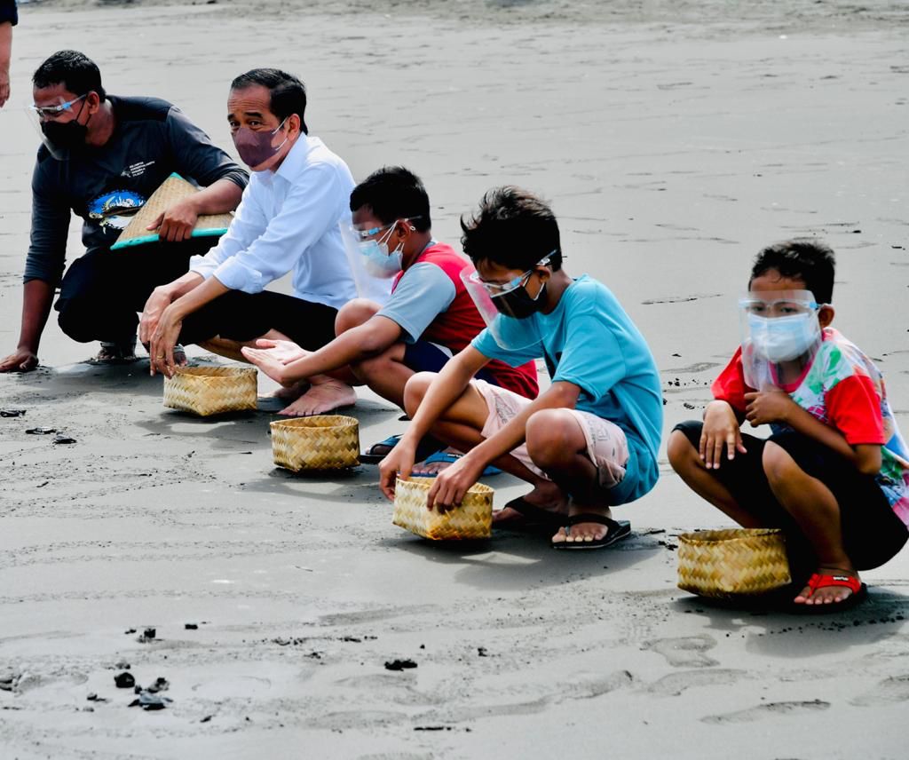 Global Cyber News.Com| Presiden Joko Widodo mengakhiri rangkaian kunjungan kerja di Kabupaten Cilacap, dengan melakukan kegiatan pelepasliaran tukik di Pantai Kemiren, Kecamatan Cilacap Selatan, pada Kamis, 23 September 2021. Melalui kegiatan tersebut, Presiden berharap kelestarian satwa penyu di Tanah Air dapat terus terjaga.
