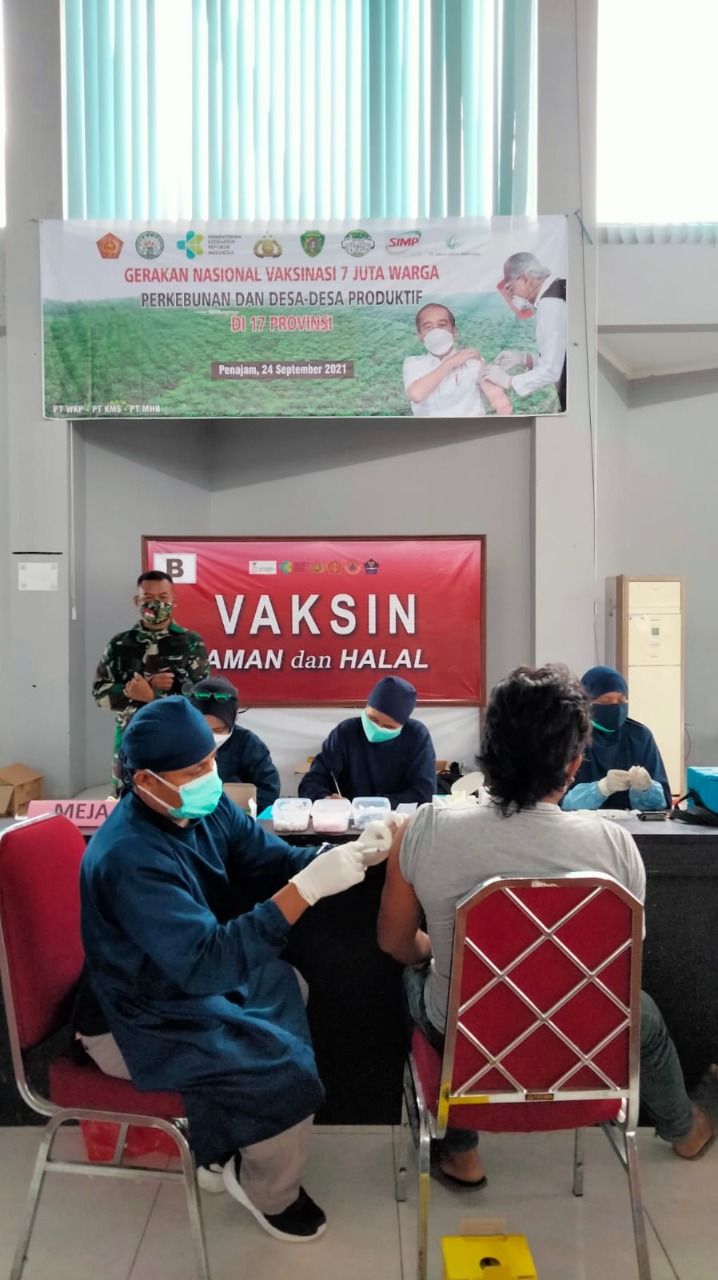Anggota Kodim 0913/PPU Bersama anggota Polres PPU mengamankan Gerakan Nasional Vaksinasi 7 Juta Warga perkebunan dan Desa-Desa produktif yang bertempat di Gedung Graha Pemuda 17 Provinsi KM 09 Kelurahan Nipah-Nipah Kecamatan Penajam Kab PPU.Jum’at (25/9/2021).