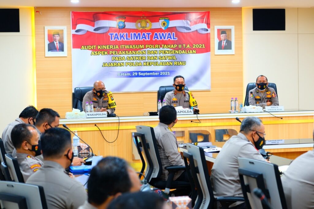 Global Cyber News.Com| Batam – Tim Audit Kinerja Itwasum Polri yang dipimpin oleh Irwil IV Itwasum Polri Brigjen. Pol. Drs. Mulyadi Kaharni, M.Si mengunjungi Polda Kepri dalam rangka melaksanakan Audit Kinerja sekaligus untuk mengetahui penyelenggaraan Program di Polda Kepri. Taklimat Awal Audit Kinerja Itwasum Polri dilaksanakan di Rupatama Polda Kepri dan dihadiri oleh Kapolda Kepri Irjen Pol Dr. Aris Budiman M.Si, Wakapolda Kepri, Irwil IV Itwasum Polri Brigjen. Pol. Drs. Mulyadi Kaharni, M.Si dan Tim serta Pejabat Utama Polda Kepri dan para Kapolres/Ta jajaran Polda Kepri. Rabu (29/9/2021).