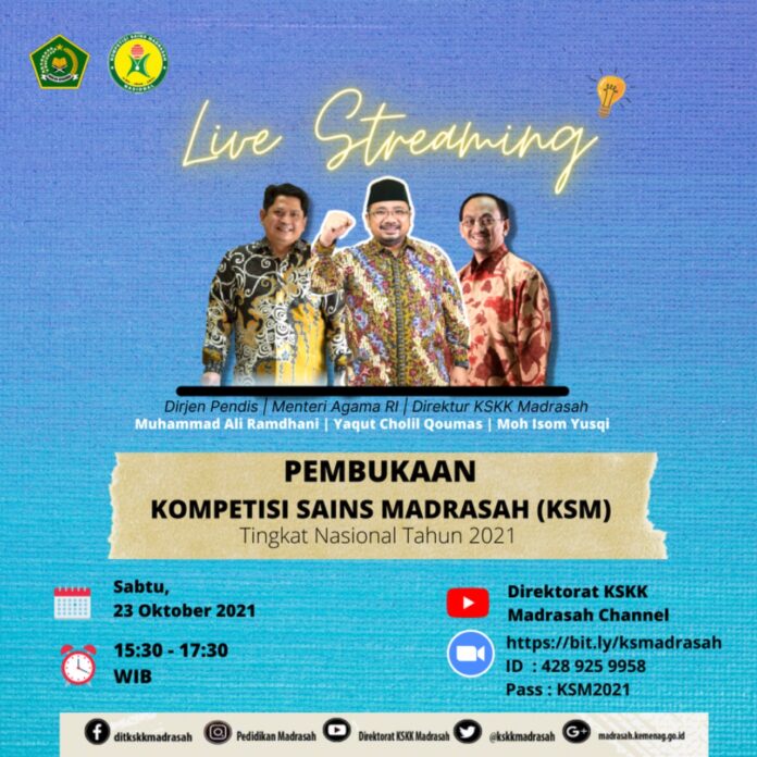 Global Cyber News.Com| Kompetisi Sains Madrasah (KSM) tahun 2021 memasuki seleksi tingkat nasional. KSM tingkat nasional ini berlangsung dua hari, 23 – 24 Oktober 2021.