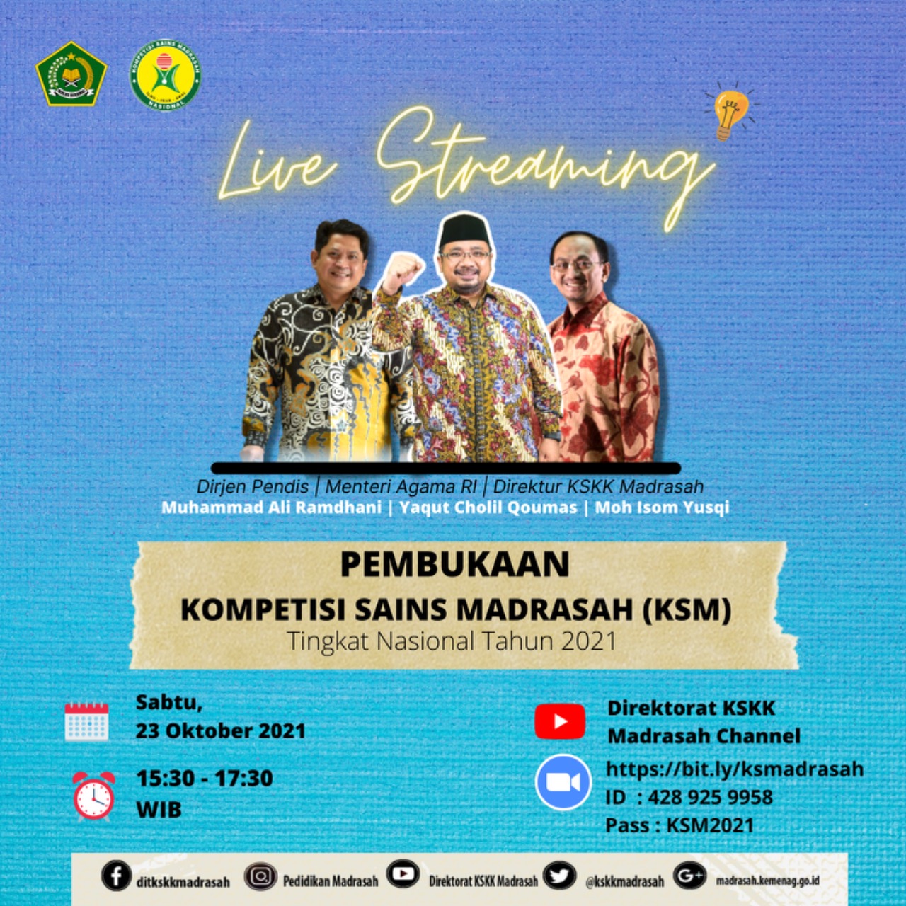 “Antusias siswa madrasah tahun ini dalam mengikuti KSM sangat bagus, dibuktikan dengan lebih dari tujuh puluh ribu siswa yang mendaftar sejak seleksi di tingkat kabupaten/kota,” terang Direktur Kurikulum, Sarana, Kelembagaan, dan Kesiswaan (KSKK) Madrasah, M Isom Yusqi di Jakarta, Sabtu (23/10/2021).