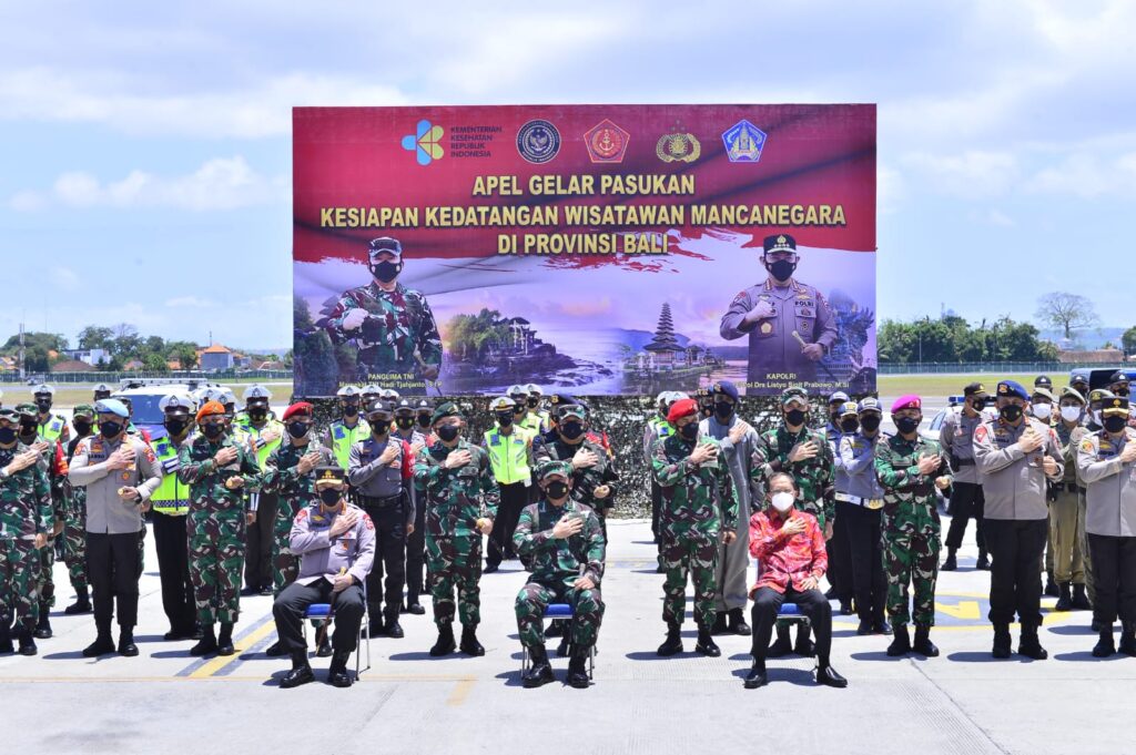 “Apel gelar pasukan ini dilaksanakan sebagai bentuk kesiapan pengamanan dan penegakan protokol kesehatan dalam rangka penerimaan wisatawan mancanegara di Bali, baik pada aspek personel maupun sarana prasarana,” kata Sigit dalam amanatnya.