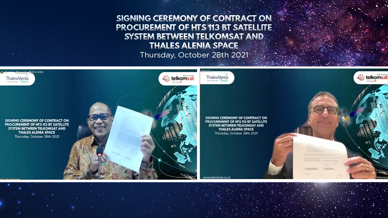 Penandatanganan kerja sama dilakukan secara online oleh Direktur Utama Telkomsat, Endi Fitri Herlianto dan President & CEO Thales Alenia Space, Hervé Derrey dari lokasi masing-masing pada Kamis (28/10). Turut hadir menyaksikan, jajaran komisaris dan senior leaders Telkomsat serta beberapa perwakilan dari Thales Alenia Space.