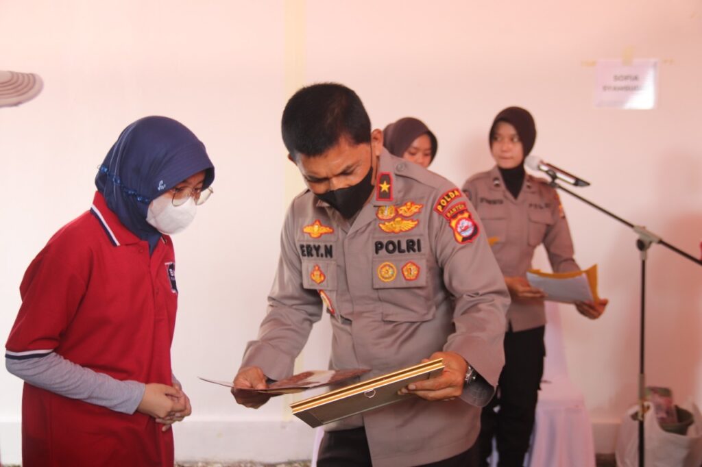 Selanjutnya Wakapolda Banten memberikan apresiasi berupa uang pembinaan dan piagam penghargaan kepada para pemenang. (Bidhumas).