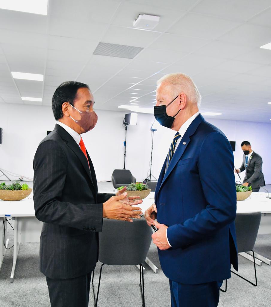 Global Cyber News.Com| Presiden Joko Widodo membahas sejumlah penguatan kerja sama Indonesia-Amerika Serikat dalam pertemuan bilateral dengan Presiden Amerika Serikat, Joe Biden, di Scottish Event Campus (SEC), Glasgow, Skotlandia, pada Senin, 1 November 2021. Presiden Jokowi mengapresiasi kerja sama yang dilakukan selama pandemi.