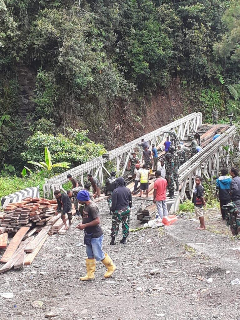 “Kita berupaya secepat mungkin memperbaiki jembatan ini, sebab jembatan ini merupakan penghubung satu-satunya wilayah Jayawijaya dan Yalimo. Kita berharap dengan selesainya perbaikan jembatan ini maka pendistribusian sembilan bahan pokok (sembako) dan BBM dari Kabupaten Jayawijaya tidak terhenti sehingga begitu roda perekonomian tetap berjalan di Kab. Yalimo,” ujar Dandim.