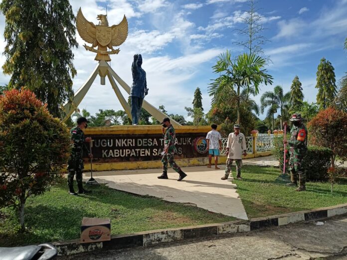 Global Cyber News.Com| Sambas, Kalbar – Memperingati hari Pahlawan ke 76, Satgas Pamtas Yonif Mekanis 643/Wns menanamkan jiwa kepahlawanan dengan mengajak para pemuda bergotong royong membersihkan Tugu Garuda NKRI di Dusun Camar Bulan, Desa Temajuk, Kec. Paloh, Kab. Sambas.