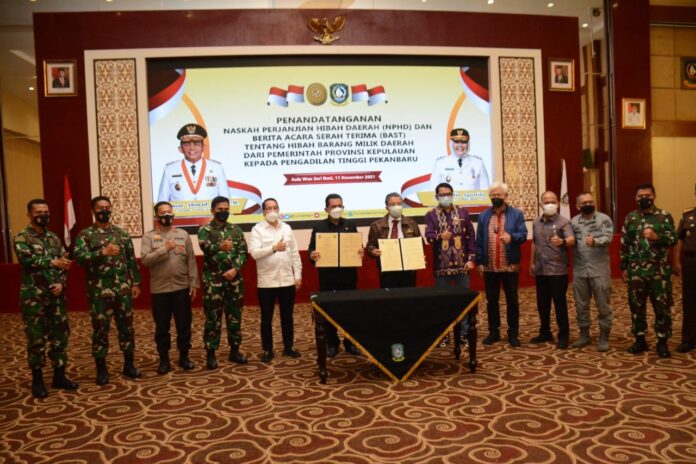 ″Kegiatan dilanjutkan dengan Penandatanganan Naskah Perjanjian Hibah Daerah (NPHD) Dan Berita Acara Serah Terima (BAST) oleh Gubernur Kepri H. Ansar Ahmad, SE, MM., bersama Ketua Tim Badan Legislatif DPR RI Firman Soebagyo, SE., M.H., Tentang Hibah Barang Milik Daerah Dari Pemerintah Provinsi Kepulauan Riau Kepada Pengadilan Tinggi Pekanbaru″. Tutup Kabid Humas Polda Kepri Kombes Pol Harry Goldenhardt S., S.IK., M.Si.