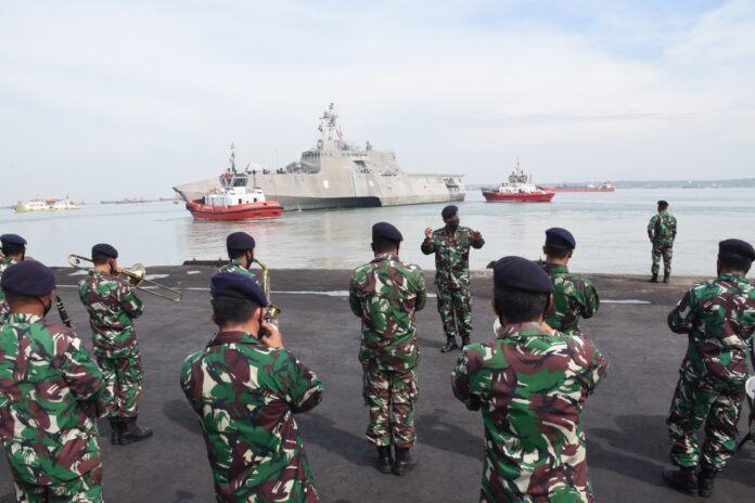 Global Cyber News.Com| Kapal perang Amerika Serikat USS Jackson LCS 6 tinggalkan Pelabuhan Tanjung Perak Surabaya. Keberangkatan Kapal milik US Navy tersebut di lepas oleh Asisten Operasi Komandan Lantamal V Kolonel Laut (P) Hreesang Wisanggeni, S.E. di Dermaga Jamrud Utara Pelabuhan Tanjung Perak Surabaya, Kamis (11/11).