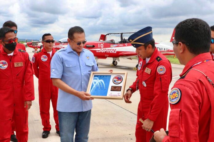 Global Cyber News.Com|LOMBOK – Ketua MPR RI Bambang Soesatyo yang juga penerima brevet utama Wing Kehormatan Penerbang Kelas 1 dari TNI AU turut bangga atas kesuksesan Jupiter Aerobatic Team (JAT) TNI-AU dalam menghiasi langit Pulau Lombok. Memeriahkan penyelenggaraan World Superbike 2021, di Sirkuit Pertamina Mandalika International Street Circuit pada 19-21 November 2021.