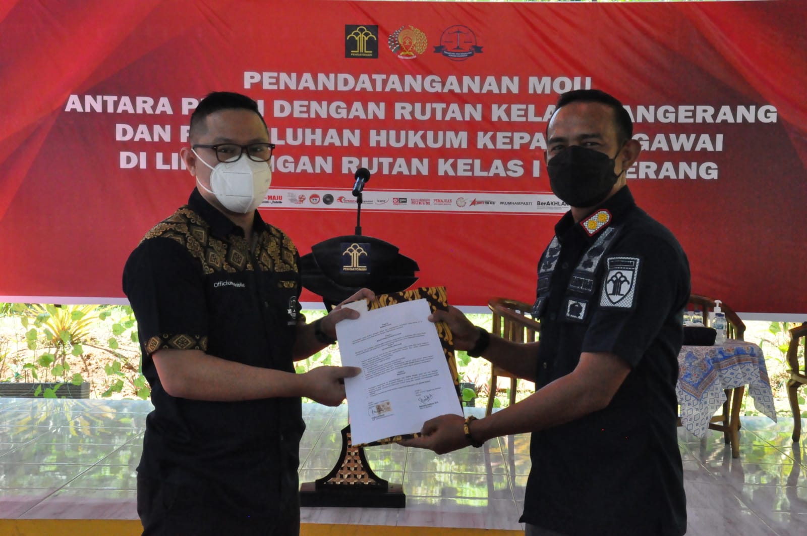 Bertempat di Auditorium Sahardjo Rutan Kelas I Tangerang, penandatanganan di lakukan oleh Fonika Affandi selaku Kepala Rutan dan Ketua DPC PPKHI Tangerang Selatan dan dihadiri oleh pejabat struktural, pegawai administrasi serta perwakilan regu pengamanan. Jum’at (26/11).