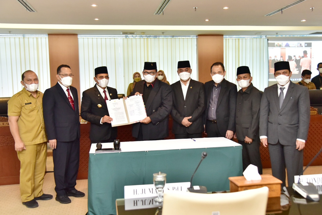 Global Cyber News.Com|-Medan I Anggaran Pendapatan dan Belanja Daerah (APBD) Provinsi Sumatera Utara (Sumut) Tahun 2022 disahkan dalam Rapat Paripurna DPRD Sumut, Senin (29/11), di gedung dewan, Jalan Imam Bonjol Nomor 5 Medan. Hal itu ditandai dengan penandatanganan persetujuan bersama oleh Gubernur Sumut Edy Rahmayadi dan Ketua DPRD Sumut Baskami Ginting.