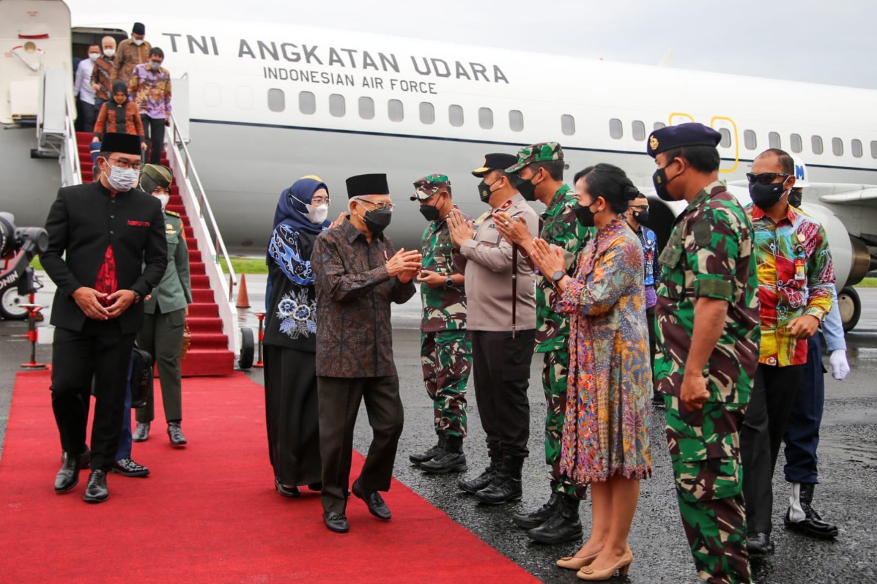 Global Cyber News.Com|Komandan Lanud Husein Sastranegara Kolonel Pnb I Gusti Putu Setia Darma, S.T., M.M., M.Han.beserta Ketua PIA AG Cab.4/D.I Lanud Husein Sastranegara Ny. Desy Putu Setia Darma menyambut kedatangan Wakil Presiden K.H. Ma’ruf Amin beserta Ibu Hj. Wury Ma’ruf Amin Bertempat di VIP Room Sompil Basuki Lanud Husein Sastranegara , Sabtu (4/12/2021).