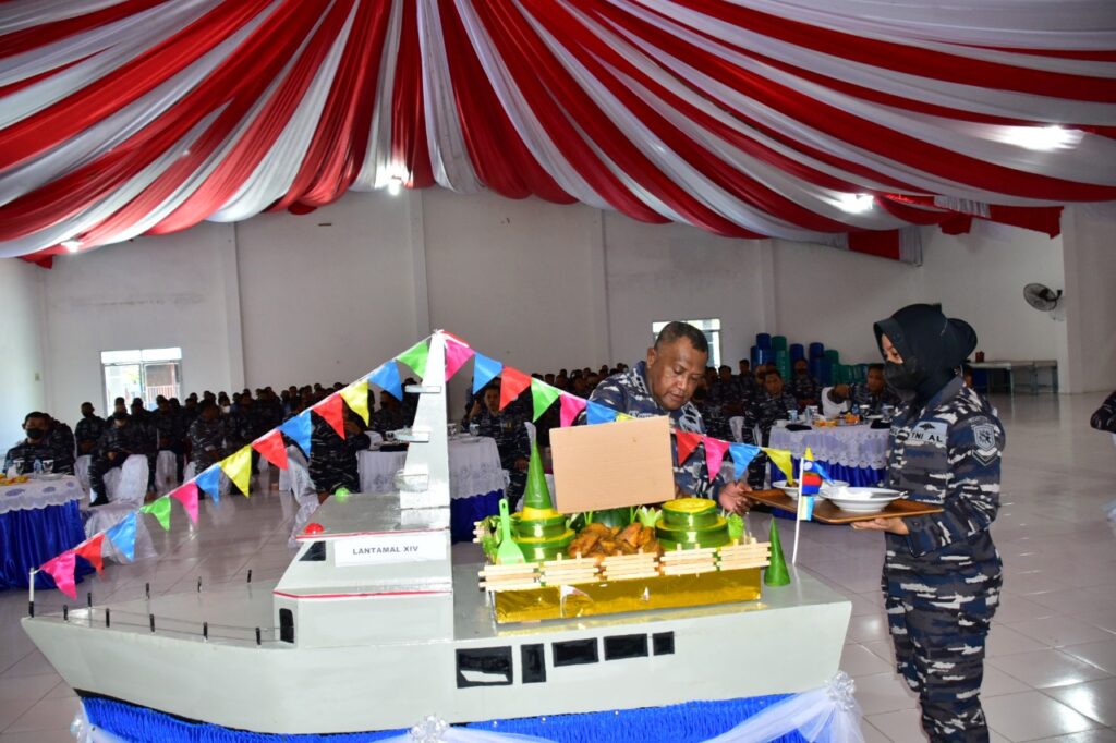 Selesai upacara dilanjutkan acara syukuran dengan pemotongan tumpeng yang di lakukan Wadan Lantamal XIV sebagai tanda ucapan syukur peringatan di Hari Armada RI yang ke-76 tahun 2021, selanjutnya diserahkan kepada Prajurit paling lama yang berdinas di Lantamal XIV yaitu Koptu Bah Zani di Gedung Serba Guna (GSG) Mako Lantamal XIV Kota Sorong,”tutupnya.