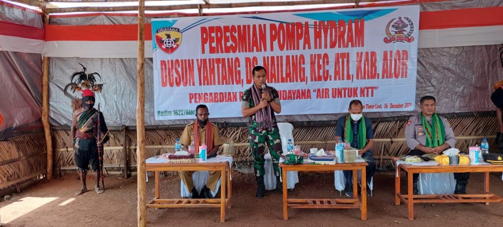 Megawali sambutannya, Dandim 1622/Alor Letkol Inf Supyan Munawar, S.Ag mengajak kepada masyarakat untuk selalu bersyukur kepada Tuhan Yang Maha Kuasa karena atas ijinnya, maka pembangunan pompa hidram bisa terlaksana sejak awal dan hari ini akan diresmikan oleh Bupati Alor.