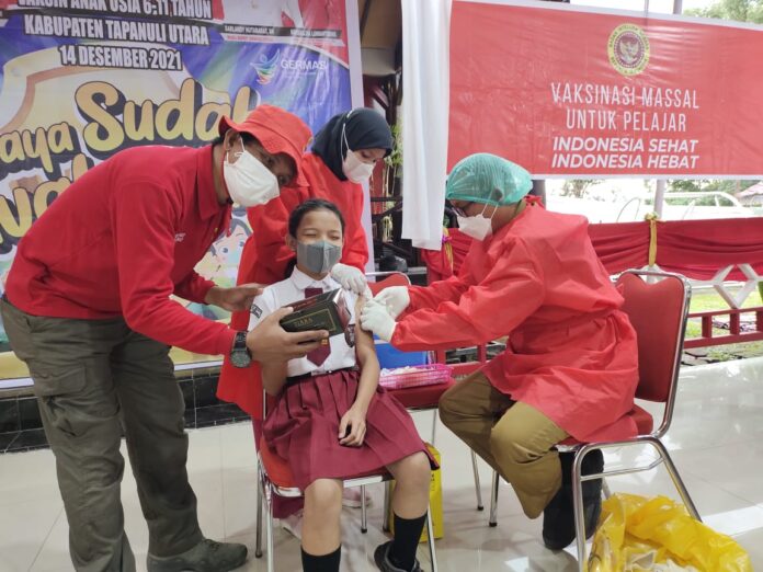 Global Cyber News.Com| TAPUT,  Launching Vaksinasi massal untuk pelajar kelompok usia 6-11 tahun diselenggarakan di Sopo Rakyat rumah dinas Bupati Tapanuli Utara, Selasa, (14/12/2021).