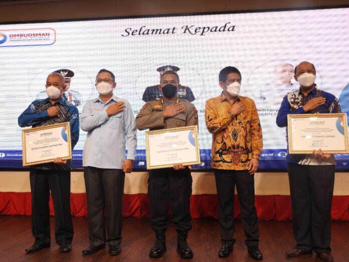 Global Cyber News.Com| Batam – Ombudsman Republik Indonesia perwakilan Kepulauan Riau memberikan Apresiasi atas Partisipasi pada Kampanye bersama Pelayanan Publik Se-Kepulauan Riau Tahun 2021 pada Polda Kepulauan Riau, dalam kesempatan tersebut Polda Kepri meraih dua Apresiasi dengan Kategori Kampanye paling kreatif dan kampanye terbanyak, kegiatan tersebut dihadiri oleh Gubernur Kepulauan Riau. H. Ansar Ahmad, SE, MM, Irwasda Polda Kepri diwakilkan oleh Auditor Madya TK. III Itwasda Polda Kepri Kombes Pol Eko Budhi Purwono, S.Ik, dan para Walikota serta Bupati Se-Provinsi Kepri. Bertempat di Ballroom Love Seafood, Batam Center, Kota Batam. Kamis, (16/12/2021).