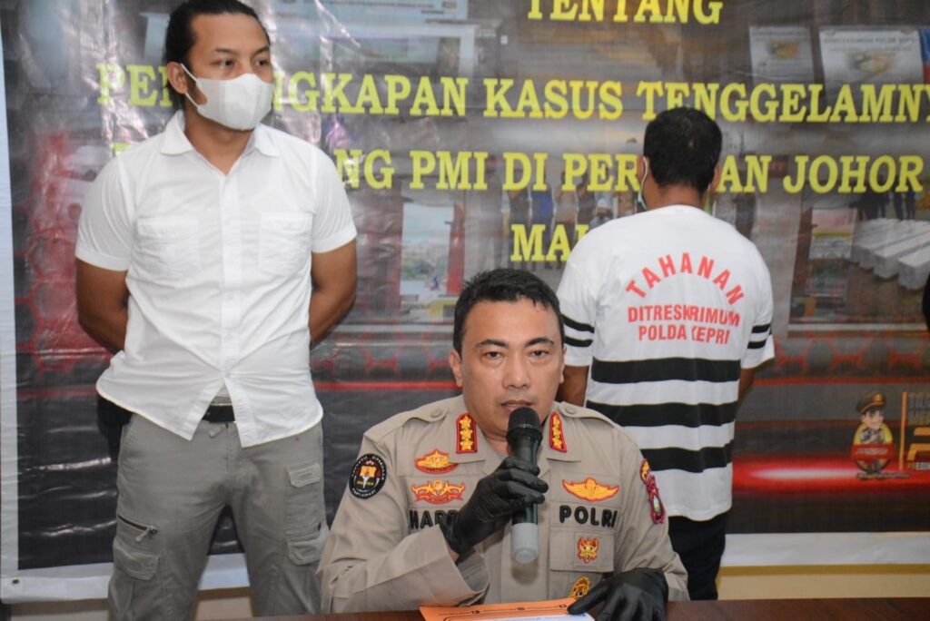 Global Cyber News.Com| Batam – Seorang tersangka Inisial M Alias Ong yang mempunyai hubungan dengan tiga tersangka lainnya Inisial S Alias A, JI Alias J Dan AS Alias AB yang merupakan jaringan dalam pengiriman PMI ke Malaysia berhasil diamankan oleh Ditreskrimum Polda Kepri dan di Back Up oleh Tim Puma Jatanras Ditreskrimum Polda NTB. Hal tersebut disampaikan oleh Kabid Humas Polda Kepri Kombes Pol Harry Goldenhardt S., S.IK., M.Si, didampingi Dir Reskrimum Polda Kepri Kombes. Pol. Jefri Ronald Parulian Siagian, S.I.K., M.Si. Saat Konferensi Pers di Polda Kepri. Rabu, (3/1/2022).