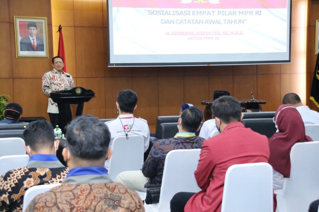 penggerak dalam implementasi nilai-nilai kebangsaan,” ujar Bamsoet dalam Sosialisasi Empat Pilar MPR RI sekaligus Catatan Awal Tahun 2022 bersama Organisasi Kemahasiswaan Cipayung Plus, di Komplek MPR RI RI, Jakarta, Selasa (11/1/22).