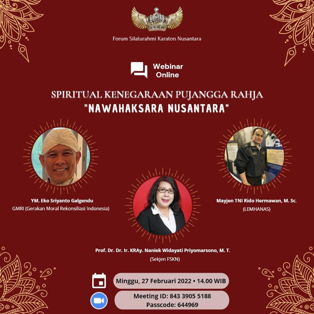 Global Cyber News.Com|Forum Silaturrachmi Keraton Nusantara akan menyelenggarakan dialog tentang Spiritual Kenegaraan Pujangga Raja dengan tajuk Nawahaksara Nusantara pada hari Minggu, 27 Februari 2022 mulai pukul 14.00 hingga selesai. Untuk yang berminat dapat mengikuti melalui Meeting ID 843 3905 5188 dan Passcode : 644969. Adapun pembicara utamanya adalah YM. Eko Sriyanto Galgendu dari GMRI (Gerakan Moral Rekonsiliasi Indonesia), Prof. Dr. Ir. Kray. Naniek Widayati Priyomarsono M.T, Sekretaris Jendral FSKN (Forum Silaturrachmi Keraton Nusantara) dan Mayor Jendral Rido Hermawan M.Sc., Tenaga Ahli Pengajar Bidang Kewaspadaan Nasional.