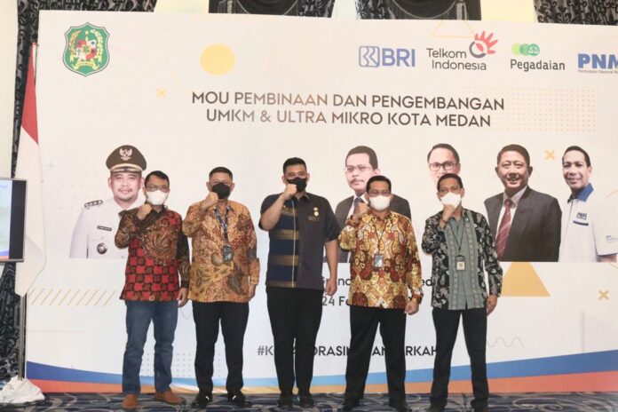 Wali Kota Medan Bobby Nasution terus bergerak untuk meningkatkan Usaha Mikro Kecil Menengah (UMKM) di kota ini. Selain menjadikan Pemko sebagai market, Bobby Nasution juga bergiat menjalin kolaborasi dengan berbagai pihak berkompeten. Kamis (24/2) siang di Heritage Grand City Hall, Bobby Nasution juga telah menandatangani Kesepakatan Bersama dengan Bank Rakyat Indonesia (BRI), PT Pegadaian, dan PT Permodalan Nasional Madani (PNM)