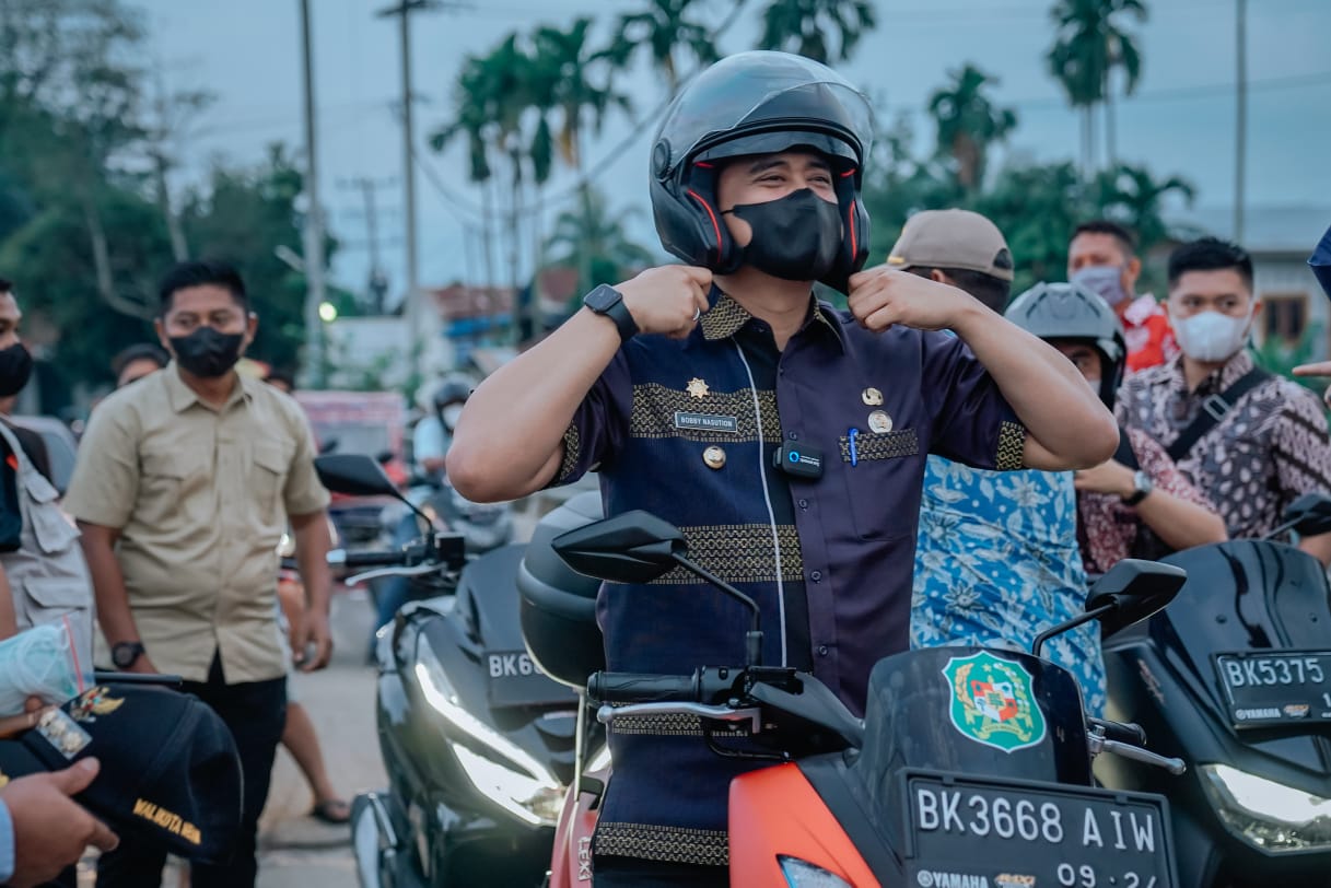 Guna mempermudah blusukan yang dilakukan di Jalan Bajak V, Kelurahan Harjosari II, Kecamatan Medan Amplas, Kamis (24/2), Wali Kota Medan Bobby Nasution mengendarai sepeda motor dengan membonceng Sekda Kota Medan Wiriya Alrahman. Selain banjir, drainase dan jalan rusak, lampu jalan yang mati menjadi keluhan warga sekitar.